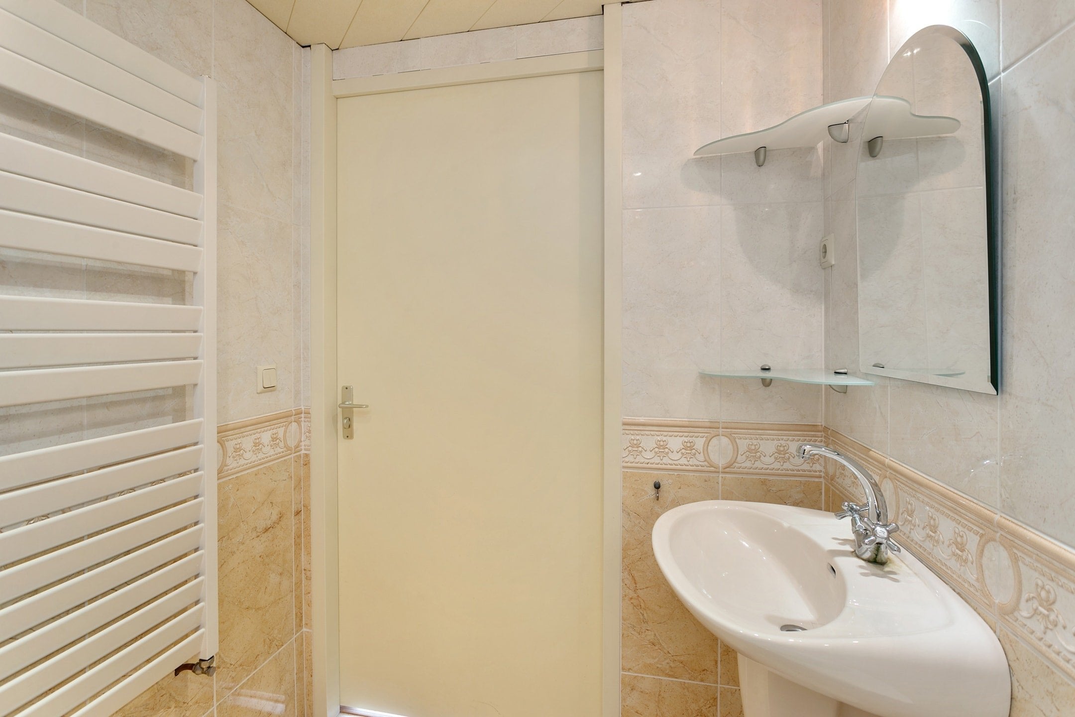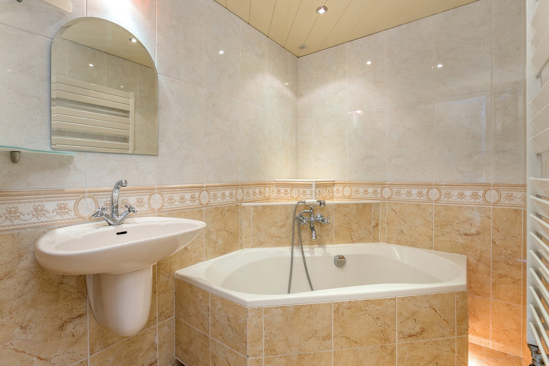 Aansluitend aan de slaapkamer een geheel betegelde badkamer met ligbad, vaste wastafel en designradiator.