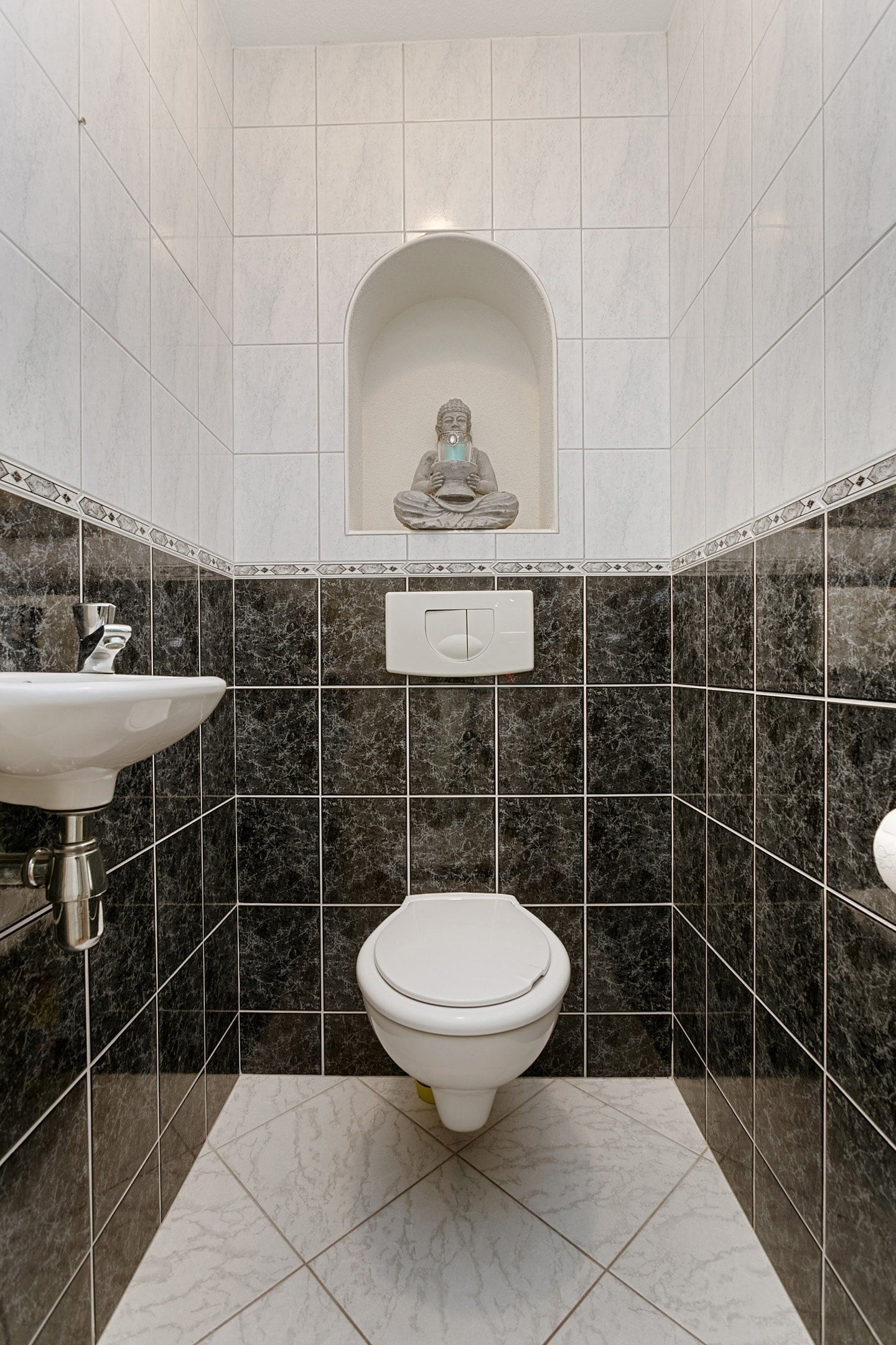 Betegeld toilet met vrijdragend toilet met fonteintje.