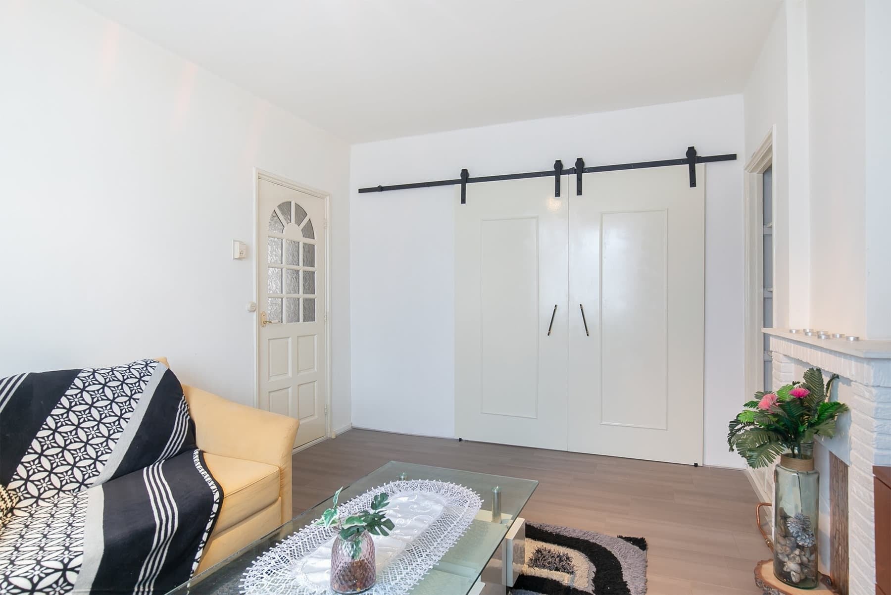 - Slaapkamer 2 (ca. 9 m²) met tweepersoonsbed, ook aan de achterzijde en bereikbaar via schuifdeuren vanuit de woonkamer.