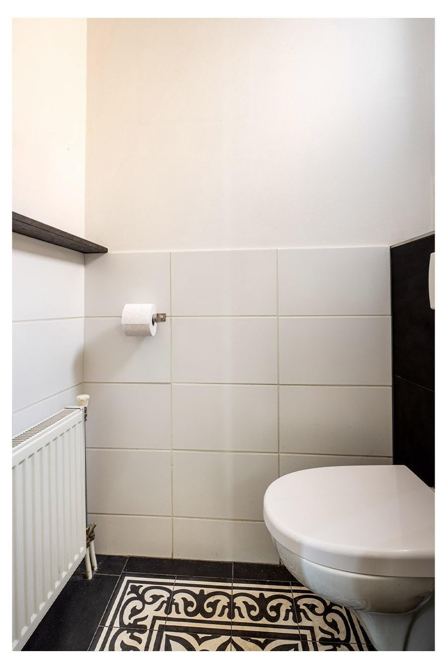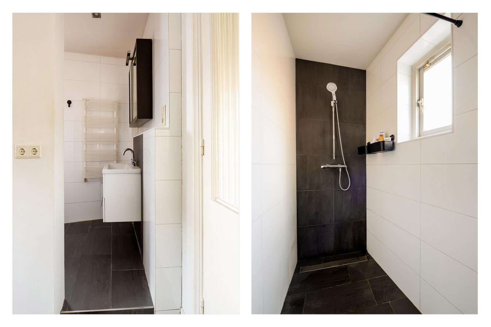 Overloop met toegang tot het eerste appartement. Dit appartement beschikt over een lichte woonkamer met open keuken en een slaapkamer met aangrenzende badkamer. De badkamer is voorzien van een inloopdouche, handdoekradiator en een wastafelmeubel. Op de overloop bevinden zich tevens een praktische kastruimte met aansluiting voor de wasmachine en een separate ruimte voor de cv-installatie, welke beide verdiepingen bedient.
