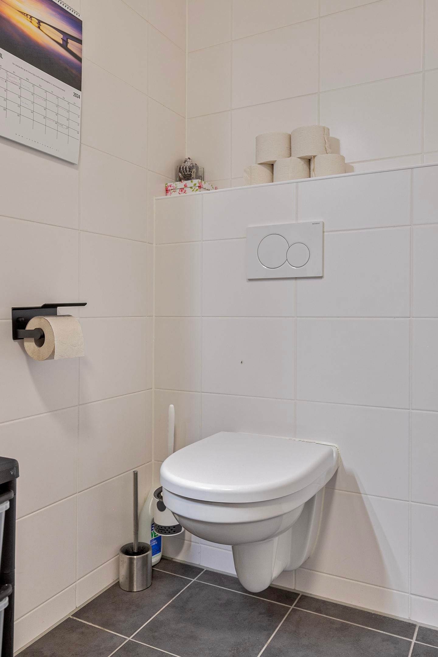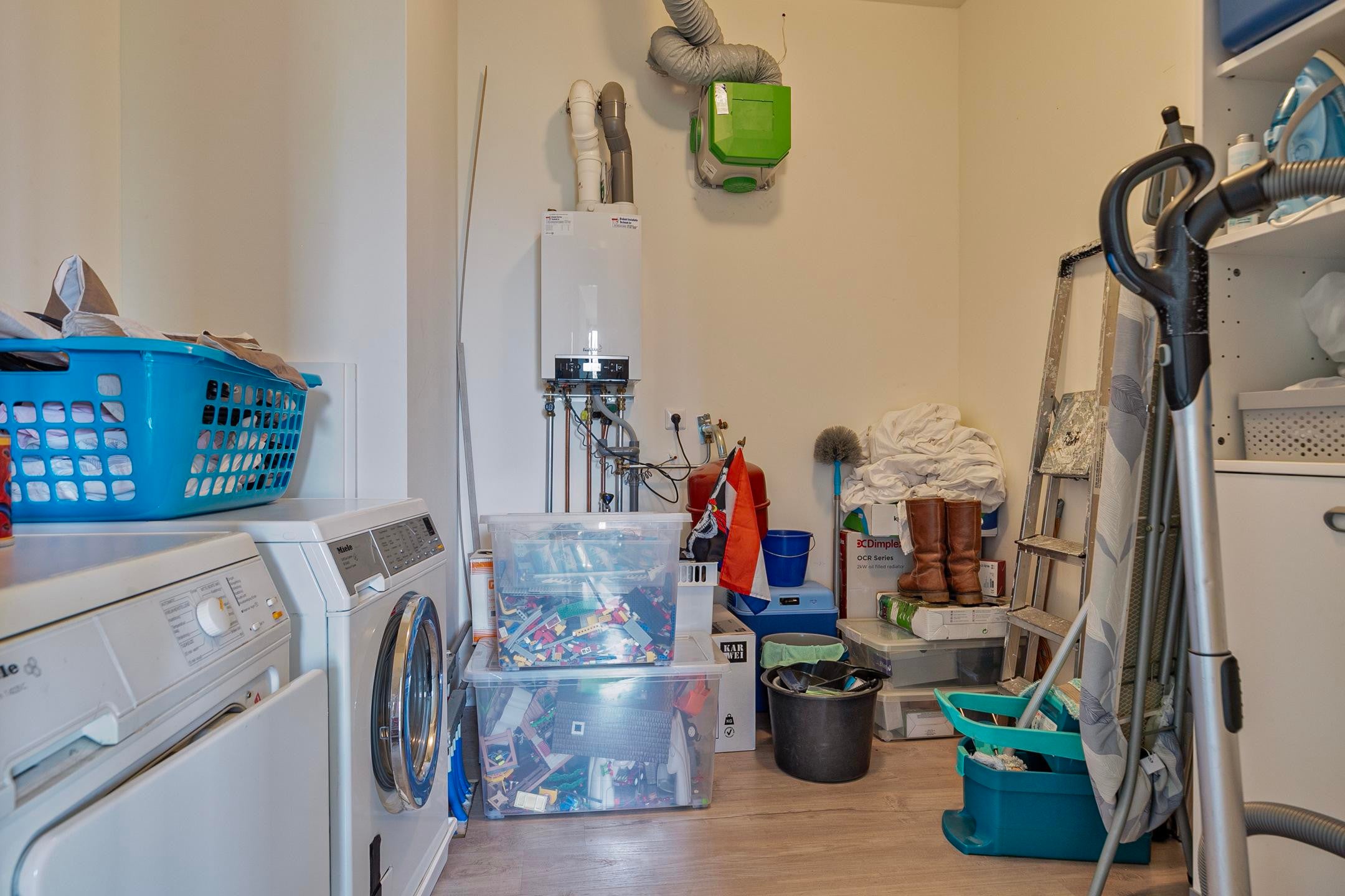 Entree/hal voorzien van fraaie lichte pvc vloer, meterkast, betegelde toiletruimte met wandcloset voorzien van inbouw reservoir en fonteintje, berging/wasruimte (ca. 2.58×2.68/2.06m.) met aansluitingen ten behoeve van wasapparatuur, cv-combiketel (HR 2011) en unit ten behoeve van de mechanische ventilatie.